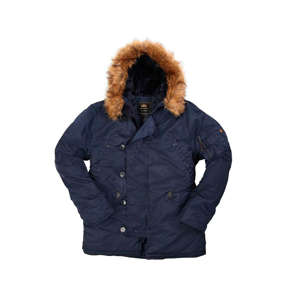 Alphas ultimate cold weather parka with a flight nylon shell, storm flap and zipper, and an adjustable hood lined with faux mouton and trimmed with removable faux fur. Features include two large snap closure chest pockets, two lower flap pockets, reinforced elbows, storm cuffs, and zippered utility/pencil pocket..