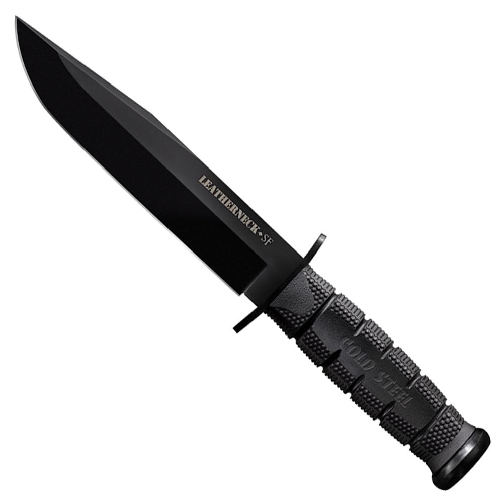 This military style fixed blade is your comrade in arms. It's no wonder they call it the Leatherneck Semper Fi - Latin for always loyal. The clip point blade is made of ultra-tough D2 tool steel and sharpened with a saber grind for increased cutting power. The full tang handle is covered with intricately textured Kray-Ex and capped with a double quilllon guard and a machined steel pommel for hammer strikes. The entire knife has a matte black finish, including the powder coated blade, for tactical operation and night camouflage. A Secure-Ex belt sheath is included for convenient carry.