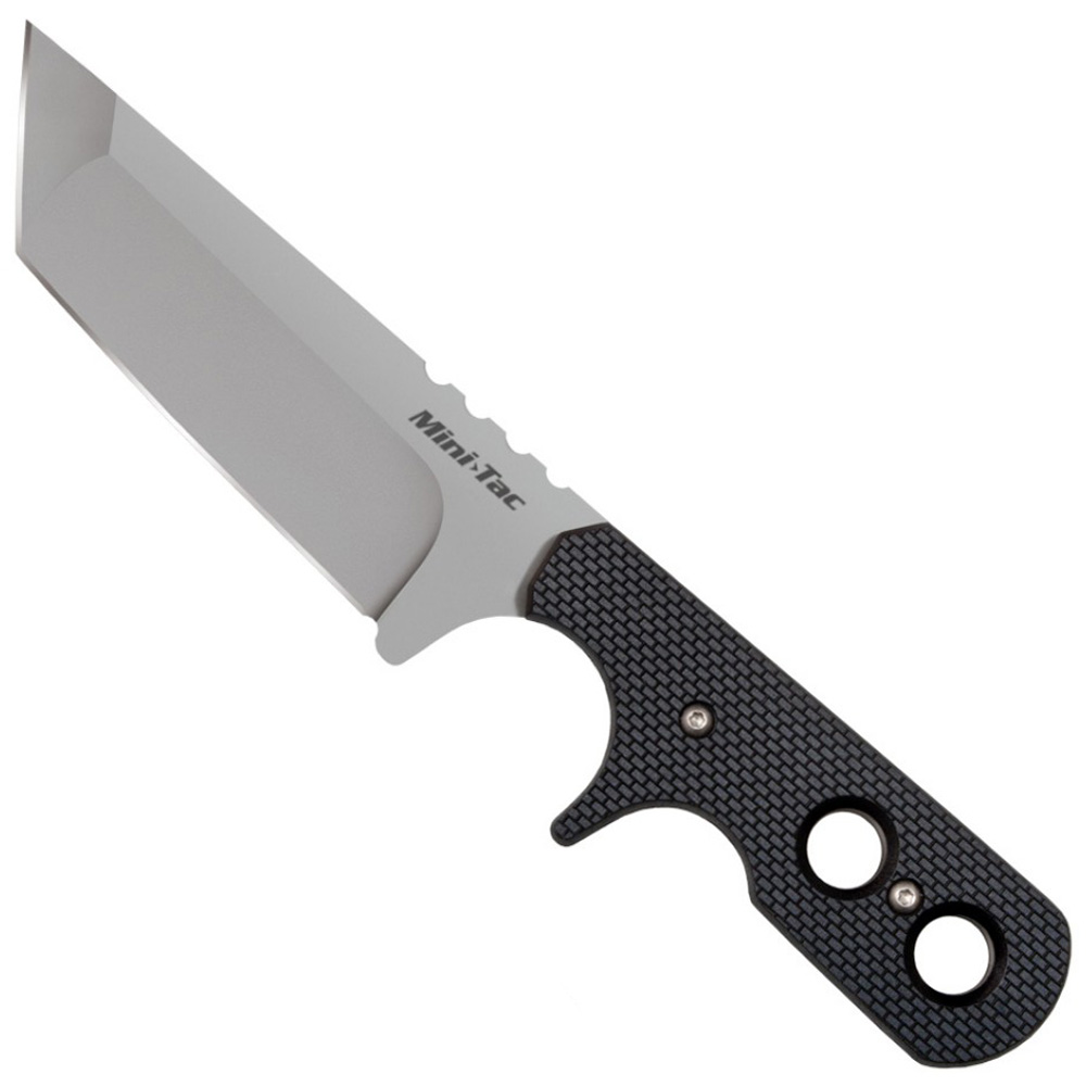 Cold Steel's new generation of Mini Tac Neck Knives are astonishingly light at 3 ounces each. Because they're so lightweight, they can be comfortably worn practically 24 hours a day. With their sturdy bead chain lanyards and their rugged Secure Ex® sheaths (specially designed to snugly retain the knife while allowing a speedy draw stroke), they can be worn outside clothing and perform as a handy utility or rescue knife. They can also be carried more discreetly under a shirt or blouse, or inside a coat. They can even be used for camping or hiking as they can easily be tied or taped anywhere from a backpack to a fanny pack. Their versatility is virtually endless. Fashioned from AUS 8A stainless steel and reflecting state of the art heat treatment they are honed to a razor edge and exhibit incredible toughness for such a small knife, due in part to their full tang construction. Tough, rough, and ready for anything, they come equipped with thin high quality black Faux G-10 handle scales. This feature allows them to lie flat and close against the body and provide an aggressive gripping surface. Also when these scales are combined with integral sub hilt they give the fingers of the hand incredible purchase and allow a remarkably secure grip that resists rolling or twisting.