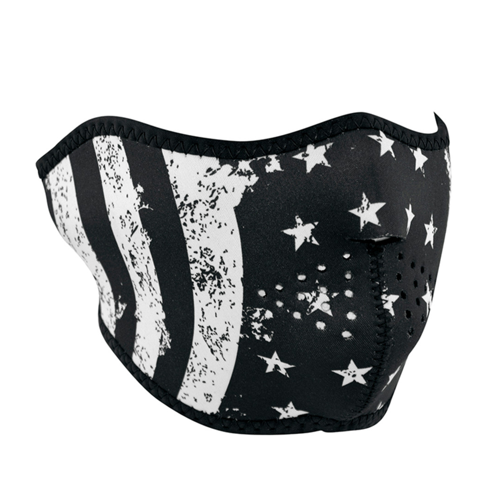 Neoprene Half Face Mask features full coverage of nose, chin, and cheeks with stretchy neoprene material that's water resistant and provides warmth. Its bound nylon edges offers added comfort and durability, while the hook and loop closure ensures great fit. Reversible, one size fits most. Black and White Vintage Flag Face design. Material: 70% Neoprene, 30% Polyester.