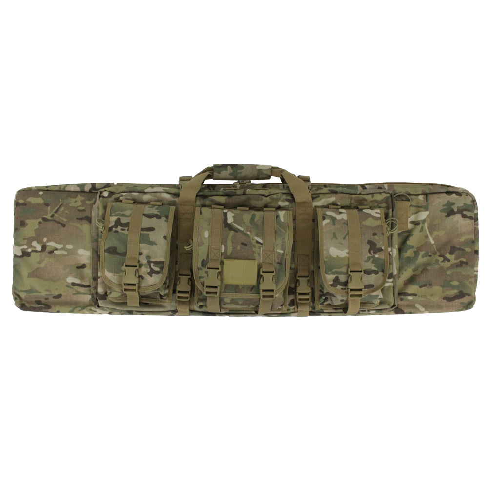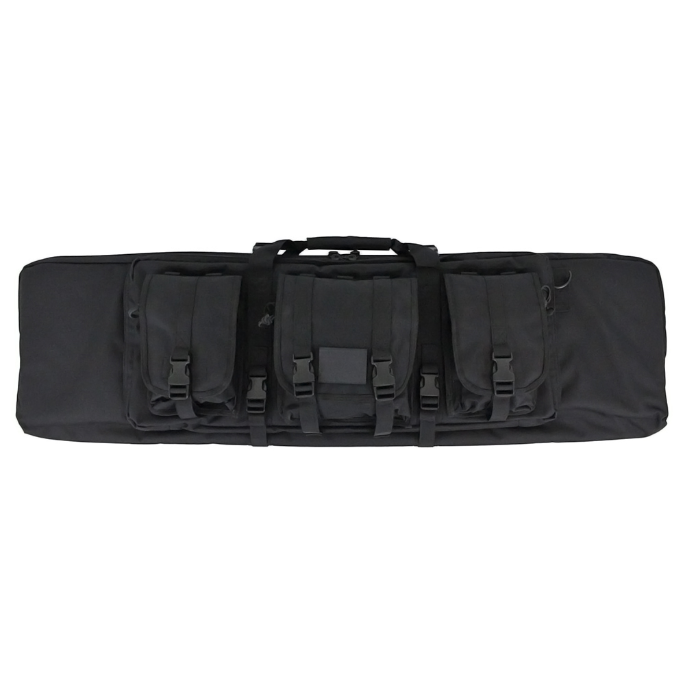The Raven X Modular Rifle Case will get your guns and gear to the field with comfort and style. The main double-zipper compartment is surrounded by a thick wall of padding and equipped with hook and loop straps to secure any rifles up to 42" in length. The outer compartment has two sleeves to hold smaller side arms, like pistols or SMG. The front of the case is lined with MOLLE webbing and comes with three modular utility pouches to store loose ammo, spare magazines, and RIS accessories. You can customize your setup to maximize storage space, or strip it down for a light-weight load. In addition to the carry handle, the bag comes with a removable shoulder strap for comfortable transport in the field.