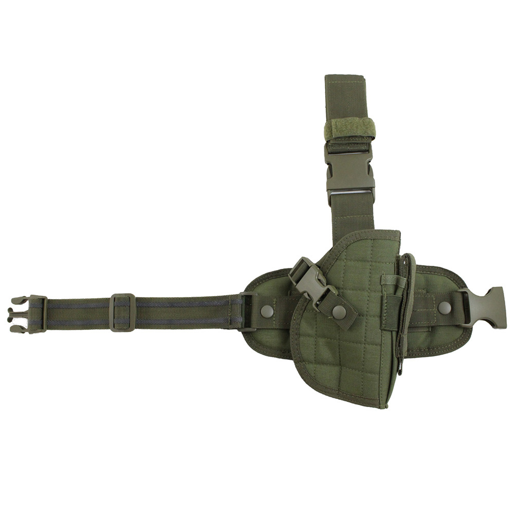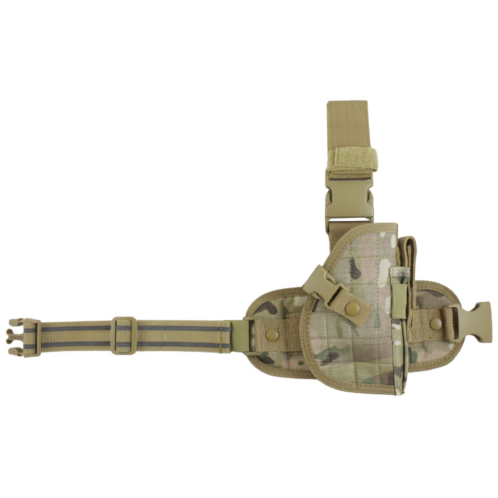 This Raven X drop leg panel has a removable pistol holster and a spare magazine pouch. The panel has an extra thick cushion with wide non-slip rubber straps to provide a secure and comfortable hold. Every part of the holster is adjustable to fit a wide range of leg and pistol sizes. Quick-release buckles allow for easy removal and attachment in the field. This desert tan model is camouflaged for use in arid terrain.