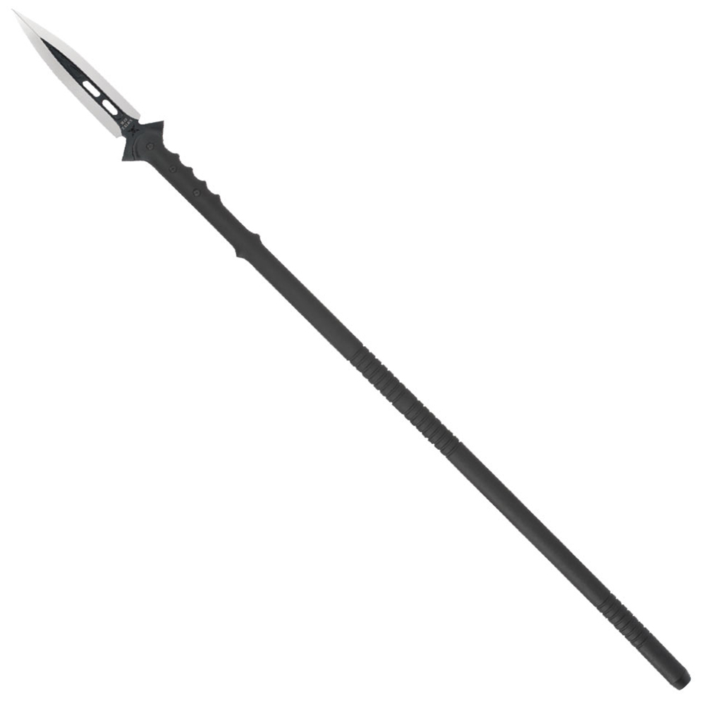 This M48 Survival Spear from United Cutlery measures in at a whopping 44 1/8" from end to end, featuring a razor-sharp 8" blade that is nearly half an inch thick! With a stainless steel blade this powerful, this spear was built for durability and strong use. Practical applications abound with this massive spear, including uses such as breaching, prying, and impaling practically anything. The handle is meticulously crafted of 30% fiberglass in the design of a cane, and is nearly indestructible. Includes rubber sheath.